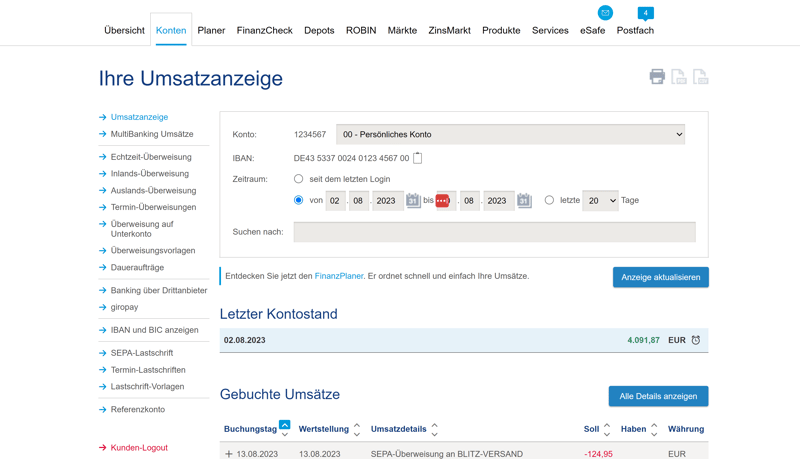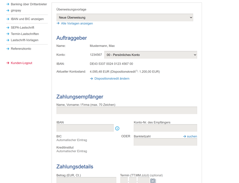 Alle Überweisungsmöglichkeiten finden Sie im Online-Banking im „Konten“-Bereich im Menü links. Hier können Sie In- und Auslandsüberweisungen durchführen, Terminüberweisungen und Daueraufträge planen und Geld auf Ihre eigenen Unterkonten überweisen. Echtzeitüberweisungen sind ebenfalls möglich, kosten aber in allen Tarifen extra.