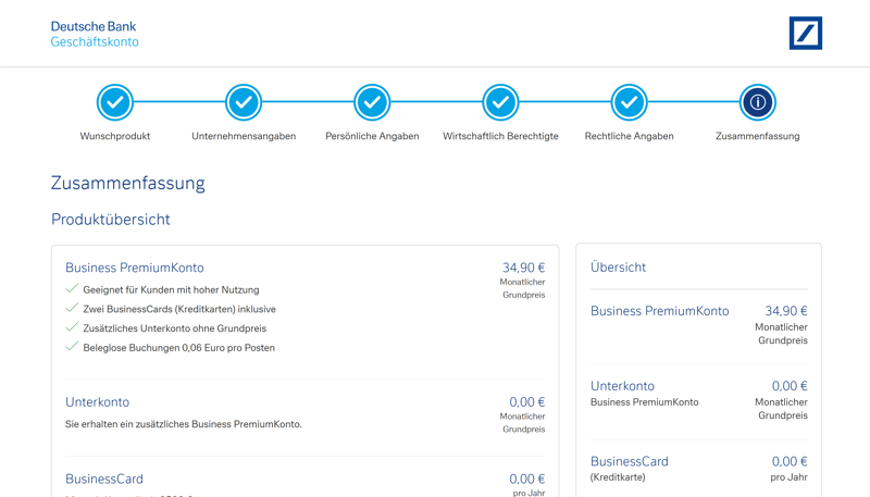Heute geht es glücklicherweise einfacher: Auch in den drei Business-Tarifen können Sie Ihr Konto mittlerweile online beantragen. Das geht in sechs Schritten: Sie müssen nur das gewünschte Produkt auswählen, alle wichtigen Angaben (zum Unternehmen, Ihrer Person, wirtschaftlich Berechtigten, sowie Rechtliches) machen und am Ende noch einmal alles bestätigen.