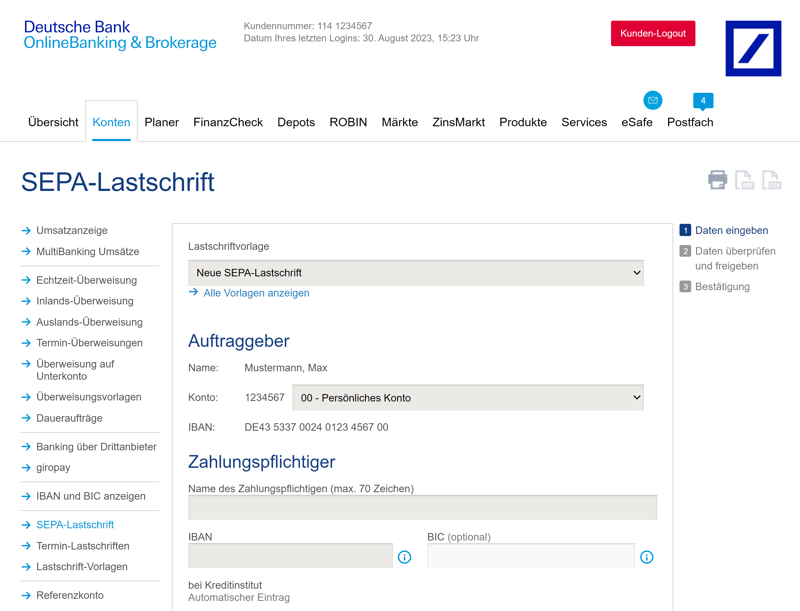 Das Geschäftskonto der Deutschen Bank unterstützt auch Lastschriften, und zwar sowohl die SEPA-Basislastschrift als auch die SEPA-Firmenlastschrift. Um für SEPA-Lastschriften freigeschaltet zu werden, benötigen Sie jedoch eine Gläubiger-ID, die Sie bei der Bundesbank erhalten.