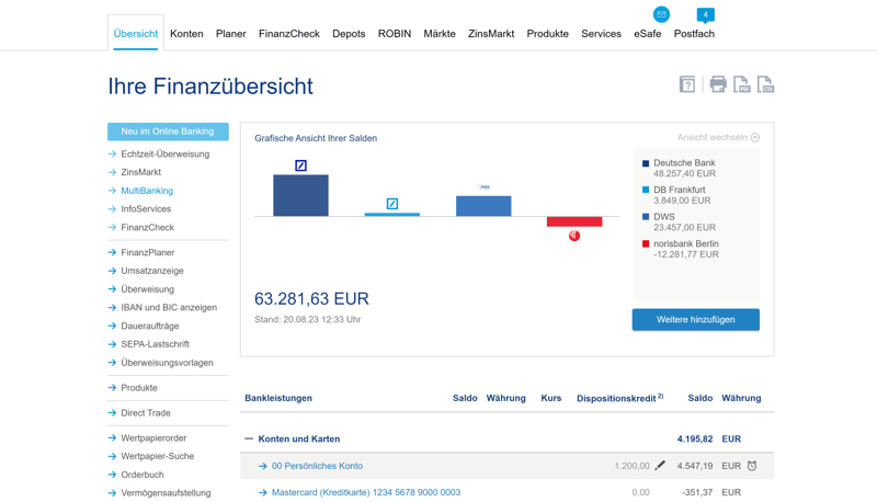 Im Kundenbereich der Deutschen Bank erwartet Sie eine klassische Online-Banking-Oberfläche, die mittlerweile etwas altbacken aussieht. Im Gegensatz zu den reduzierten, oft minimalistischen Benutzeroberflächen, die bei jüngeren Online-Banken häufig anzutreffen sind, bietet die Deutsche Bank eine breite Palette an Optionen, Einträgen und Funktionen.
