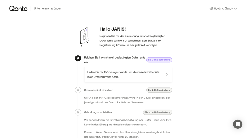 Der Prozess für Neugründungen verdient eine besondere Erwähnung: Qonto nimmt Gründer von GmbHs und anderen Unternehmen nämlich von Anfang an bei der Hand und führt sie transparent durch alle wichtigen Schritte.