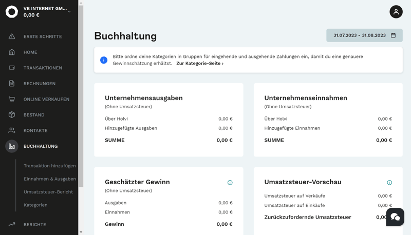 Holvi unterstützt Sie zudem auch bei der Buchhaltung. Sie können eingehende und ausgehende Zahlungen kategorisieren, um einen genauen Überblick über Ihre Ein- und Ausgaben, Ihren Gewinn und Ihre Umsatzsteuersituation zu behalten. Zudem können Sie Steuerdaten und relevante Berichte (Gewinn- und Verlustrechnung, Rechnungsbericht, USt-Bericht) für die Steuer exportieren.