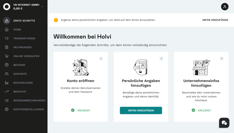 Nach dem ersten Login begrüßt Sie im Online-Banking von Holvi ein kleines Tutorial mit ersten Schritten. Damit Sie überhaupt Geld auf Ihr Holvi-Konto einzahlen können, müssen Sie Ihre E-Mail-Adresse bestätigen und einige persönliche Angaben machen.