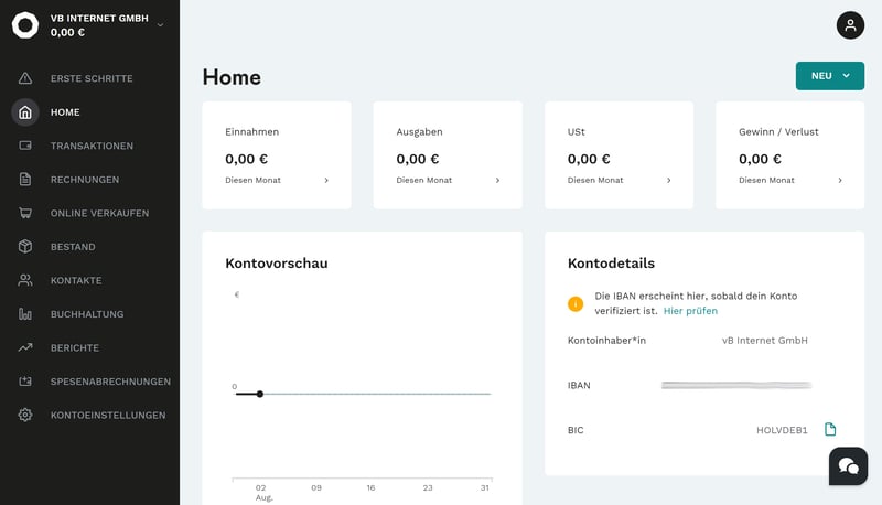 Der Home-Bereich von Holvi dient der allgemeinen Übersicht über Ihre Finanzen.