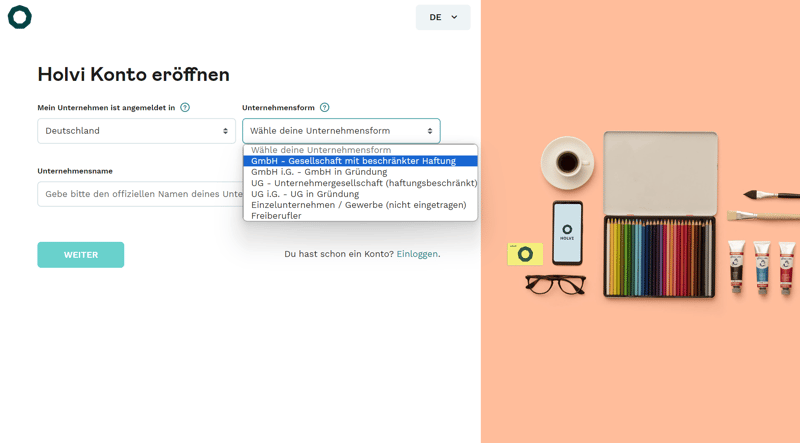 Die Kontoeröffnung ist bei Holvi ziemlich unkompliziert. Zu Beginn müssen Sie nur die wichtigsten Informationen angeben: den Namen des Unternehmens, dessen Rechtsform, Ihren Vor- und Nachnahmen und Ihren Wohnsitz. Ihre Account-Daten, also die E-Mail-Adresse und das Passwort für die Anmeldung, legen Sie gleich im ersten Schritt fest.