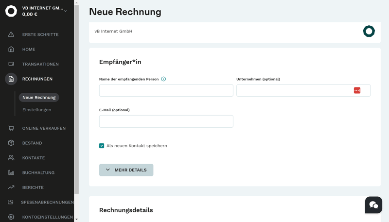 Über den „NEU“-Button oben rechts gelangen Sie zu den Eingabemasken für Rechnungen, Überweisungen und Einzahlungen.