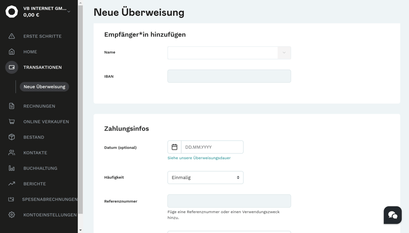 Eine neue Überweisung tätigen Sie im Holvi-Dashboard direkt im Home-Bereich oder im Transaktionen-Menü unter NEU > Überweisung. In der simplen Überweisungsmaske müssen Sie oben nur den Namen und die IBAN des Empfängers eingeben und im Bereich „Zahlungsinfos“ den Betrag festlegen.