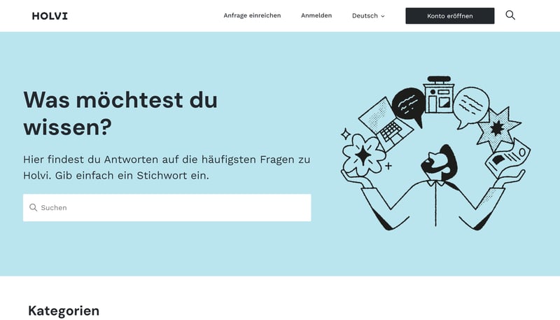 Das Hilfecenter von Holvi ist übersichtlich gestaltet. Es bietet kompakte FAQs zu den wichtigsten Fragen und eine praktische Suchfunktion, die schnell zu den richtigen Antworten führt. Die Beiträge wurden seit unserem letzten Test überarbeitet und sind heute von höherer Qualität. Sie enthalten Hyperlinks zu bestimmten Funktionen und gelegentliche GIFs und Screenshots, die die Erklärungen veranschaulichen.