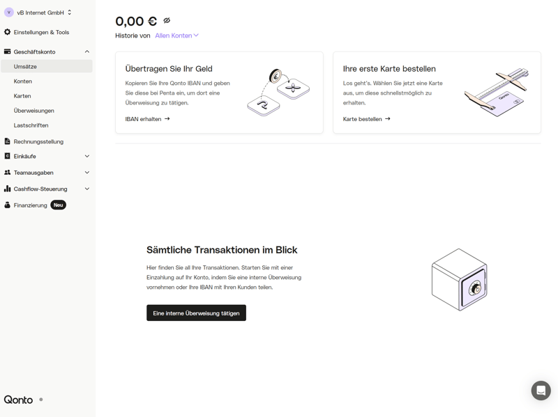 Nach der Registrierung können Sie sich im Kundenbereich von Qonto anmelden. Jener ist übersichtlich gestaltet. Über das Hauptmenü links navigieren Sie zu den verschiedenen Funktionen Ihres Geschäftskontos: