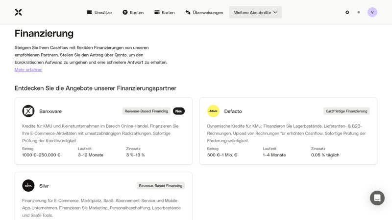 Über Qonto können Sie direkt Geschäftskredite beantragen. Dazu arbeitet Qonto mit ausgewählten Partnern zusammen, die ein einfaches Antragsverfahren und transparente Gebühren bieten.