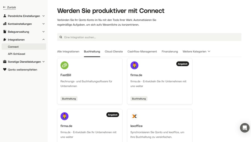 Dieser Bereich umfasst sämtliche Einstellungen – von persönlichen Präferenzen über das Unternehmensprofil bis zur Belegverwaltung. Unter Integrationen > Connect können Sie Ihr Qonto-Konto zudem mit anderen Tools wie Buchhaltungsprogrammen oder Cloud-Diensten verbinden.Rechnungsstellung