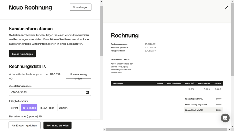 Die Rechnungsmaske ist simpel: Links machen Sie Angaben zu den Kundeninformationen, den Rechnungsdetails, den Leistungen und der Bezahlung, rechts finden Sie eine Live-Vorschau der Rechnung. Sie können Kunden hinterlegen, die Sie später in einem Dropdown-Menü nur noch auswählen müssen. Produkte und Dienstleistungen können Sie aber nicht speichern, Sie müssen sie immer manuell eingeben.