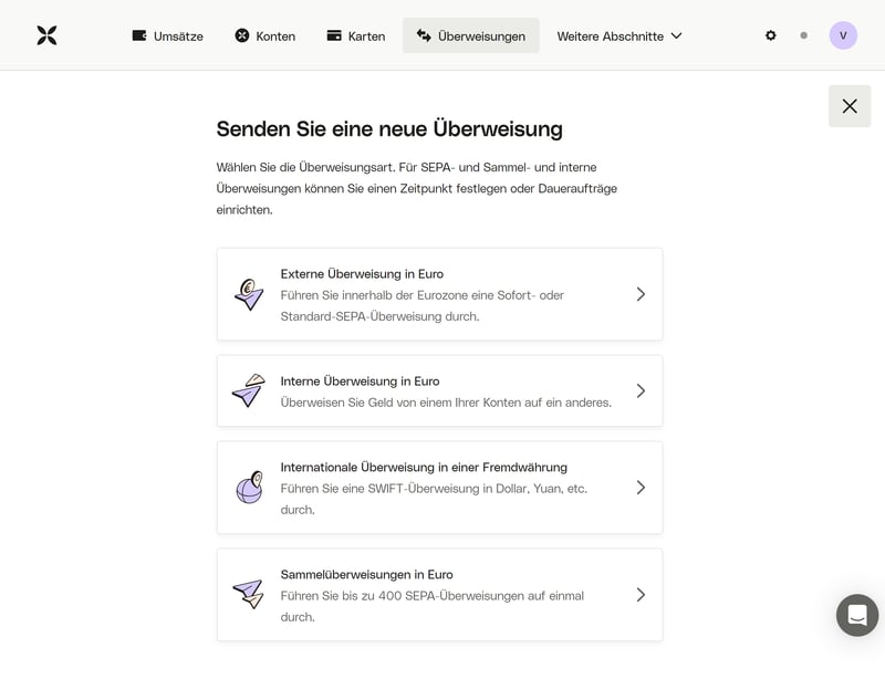 Die Benutzeroberfläche von Qonto ist relativ intuitiv und bietet schnellen Zugang zu allen wichtigen Features. Eine neue Überweisung bereiten Sie unter Geschäftskonto > Überweisungen vor. Zunächst müssen Sie dann auswählen, um welche Art Überweisung es sich handelt (intern zwischen Ihren Konten, extern in Euro, international in einer Fremdwährung, Sammelüberweisung in Euro).