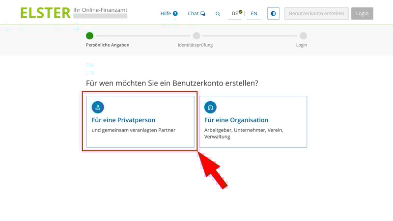 Klicken Sie auf der Startseite einfach auf „Benutzerkonto erstellen“ und wählen Sie aus, dass Sie das Konto „Für eine Privatperson“ erstellen.