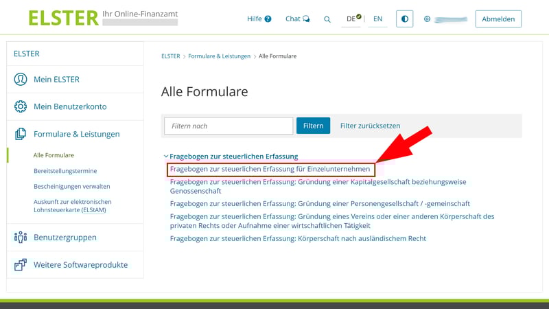 Jetzt können Sie sich bei Mein ELSTER anmelden und den Fragebogen zur steuerlichen Erfassung ausfüllen. Sie finden ihn unter „Formulare & Leistungen“ > „Alle Formulare“. Hier wählen Sie den „Fragebogen zur steuerlichen Erfassung für Einzelunternehmen“ aus: