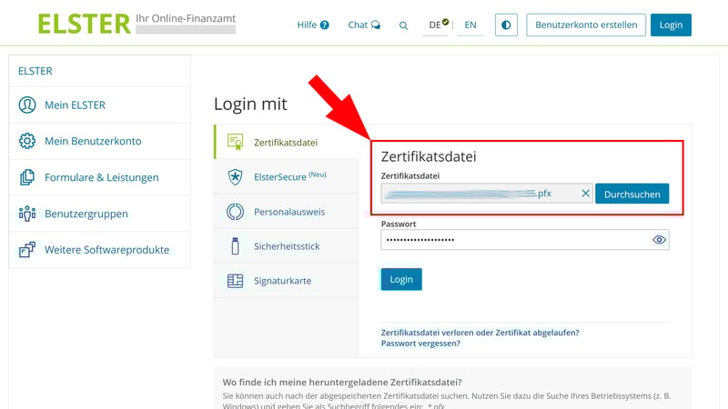 Für den Login bei Mein ELSTER benötigen Sie eine Zertifikatsdatei.