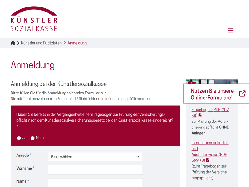 Für die KSK-Erstanmeldung gibt es ein Online-Formular.