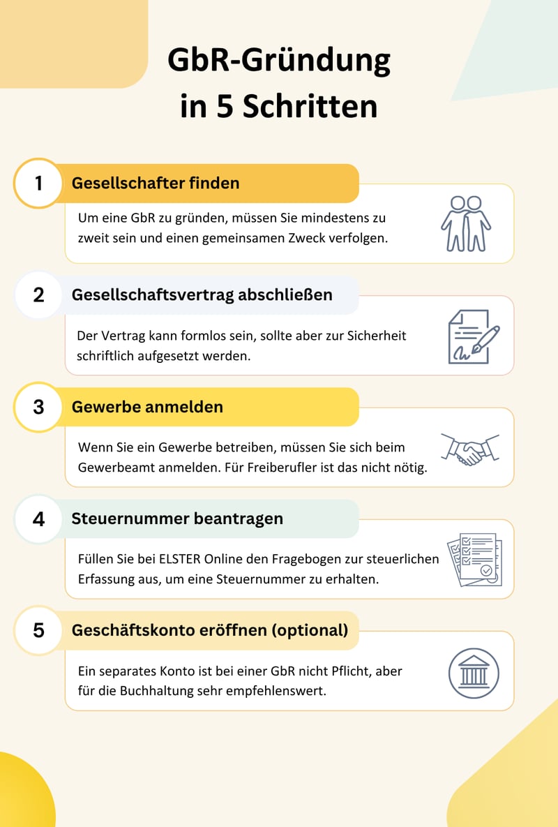 Für die Gründung reichen ein gemeinsamer Vertrag (mündlich oder schriftlich) und die Anmeldung beim Finanzamt. Bei gewerblichen Tätigkeiten ist zusätzlich eine Gewerbeanmeldung nötig. Ein schriftlicher Gesellschaftsvertrag ist nicht vorgeschrieben, aber sehr zu empfehlen.