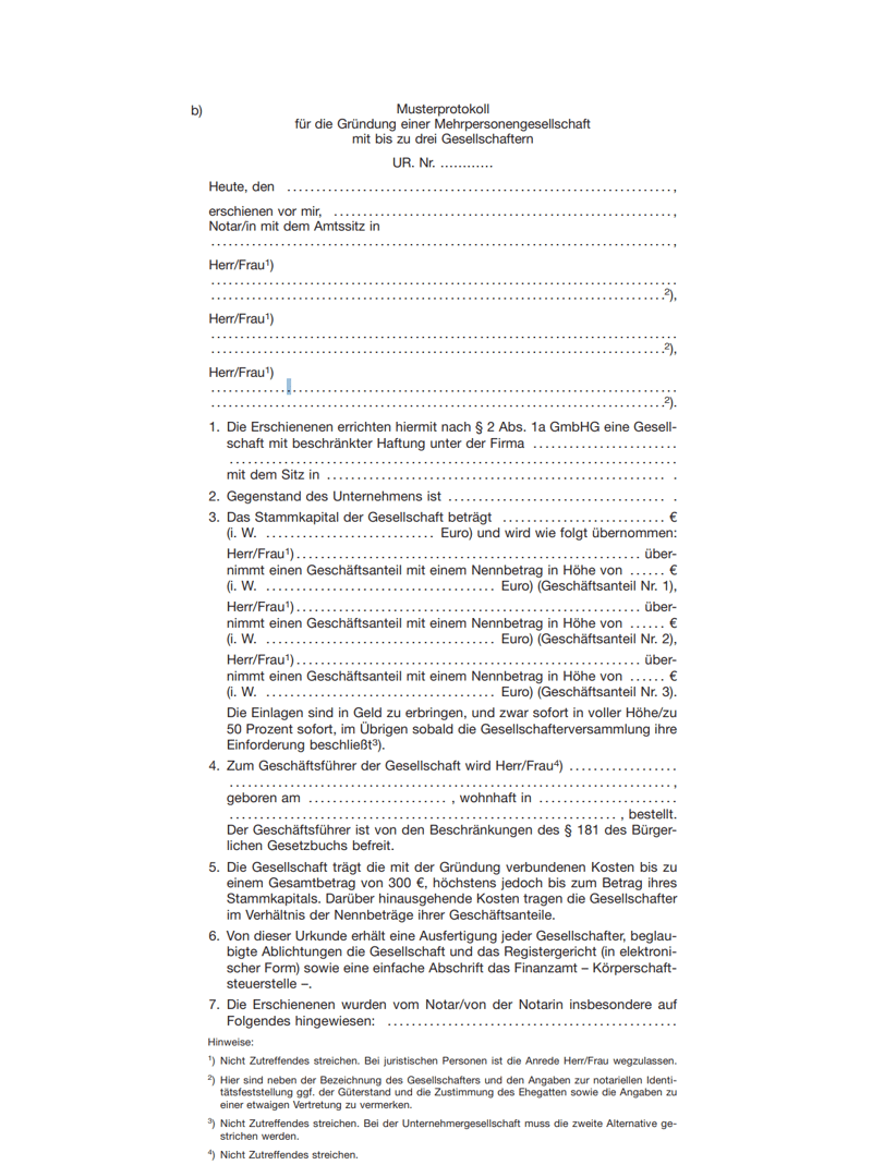 Für einfache Gründungen bietet das GmbH-Gesetz (GmbHG) in § 2 Abs. 1a eine einfachere Alternative zum individuellen Vertrag: das sogenannte Musterprotokoll. Es ist eine Art Standard-Gesellschaftsvertrag, der bereits die wichtigsten Angaben enthält.