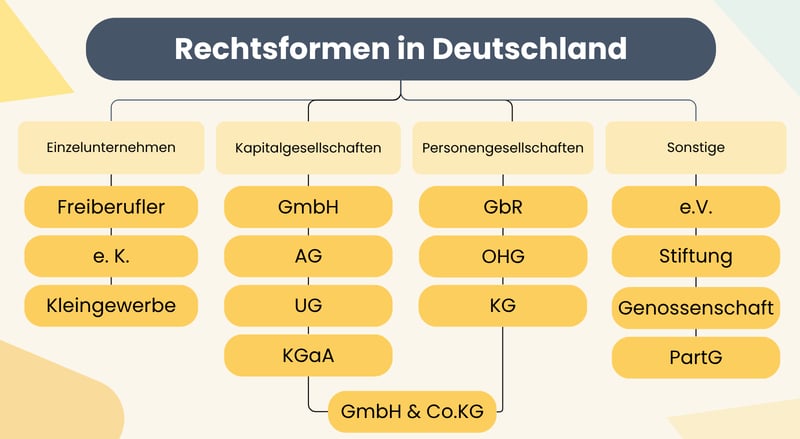 In Deutschland gibt es drei Hauptgruppen: Einzelunternehmen (z. B. Freiberufler, e.K.), Personengesellschaften (z. B. GbR, OHG, KG) und Kapitalgesellschaften (z. B. GmbH, UG).