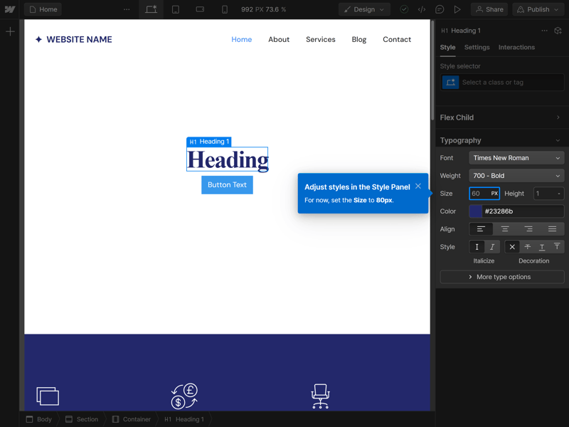 Webflow verlagert die Programmierung und Verwaltung dieser Boxen ins Frontend, sodass Sie per Drag-and-Drop Dinge umsetzen können, die normalerweise Coding erfordern würden. Dadurch bietet Webflow wesentlich mehr Gestaltungsmöglichkeiten als klassische Website-Builder, was jedoch mit einer höheren Komplexität einhergeht.