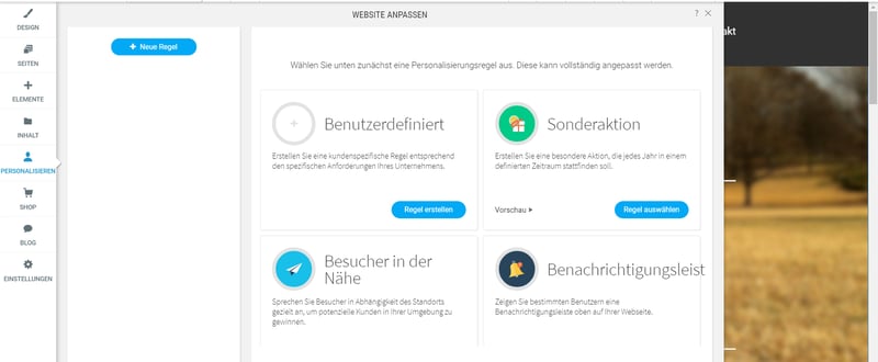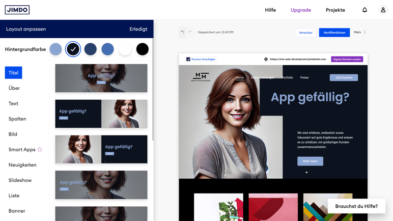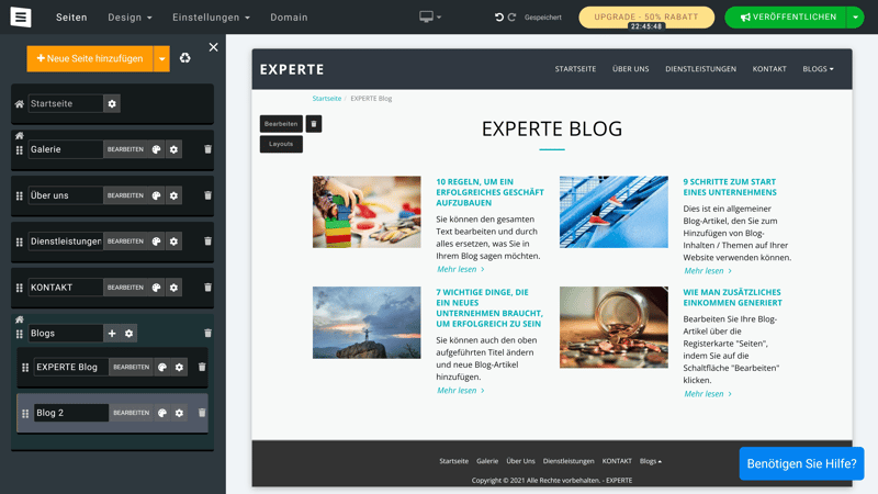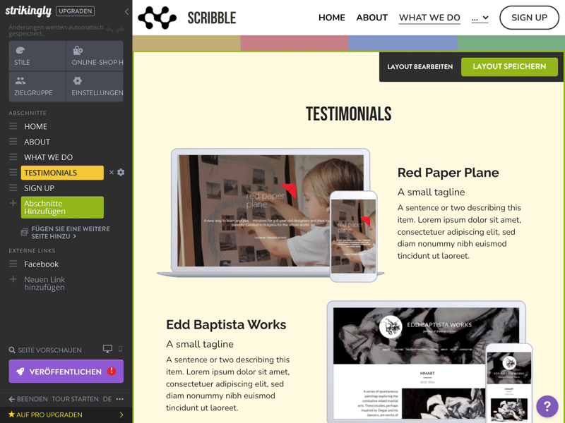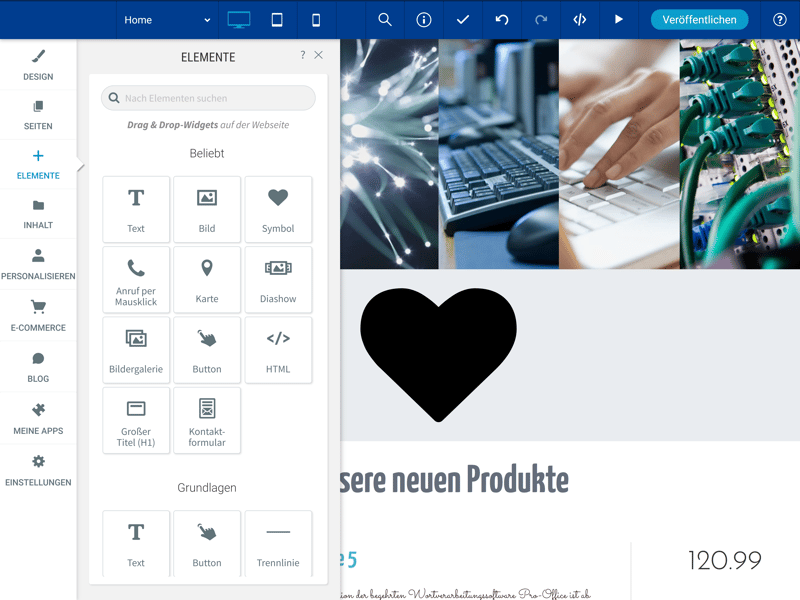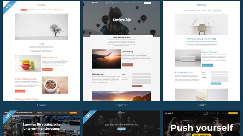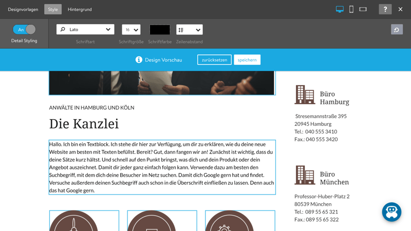 Als Baukasten-Nutzer sind Sie von dessen Funktionsumfang und den Gestaltungsmöglichkeiten seines Editors abhängig. Bestimmte Design- oder Funktionsanforderungen lassen sich möglicherweise nicht umsetzen.Designs von der Stange