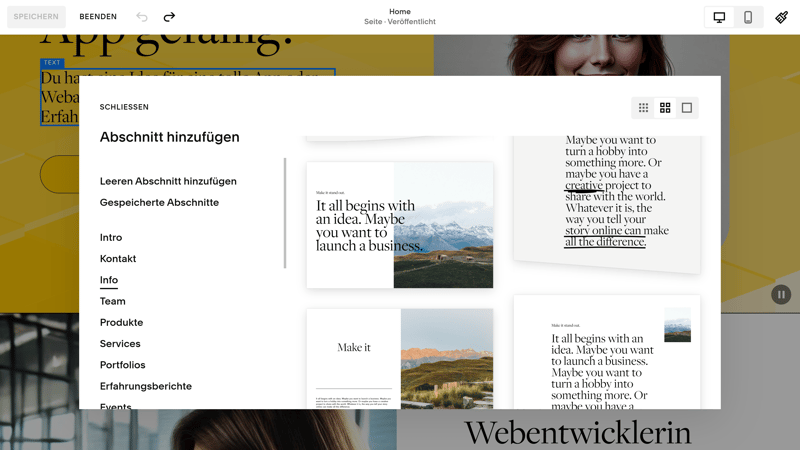 Die schicken Templates sind aber nur der Anfang. Squarespace bietet zudem eine große Auswahl an Elementen und Abschnitts- und Seitenvorlagen, mit denen Sie im Handumdrehen eine stimmige Website aufbauen können.