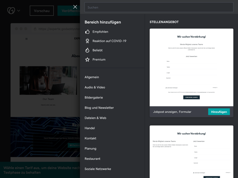 Vorlagen für ganze Seiten gibt es bei GoDaddy kaum. Die Auswahl an Abschnittsvorlagen ist deshalb am wichtigsten: Jene sind für den Look und Feel Ihrer Website hauptverantwortlich.