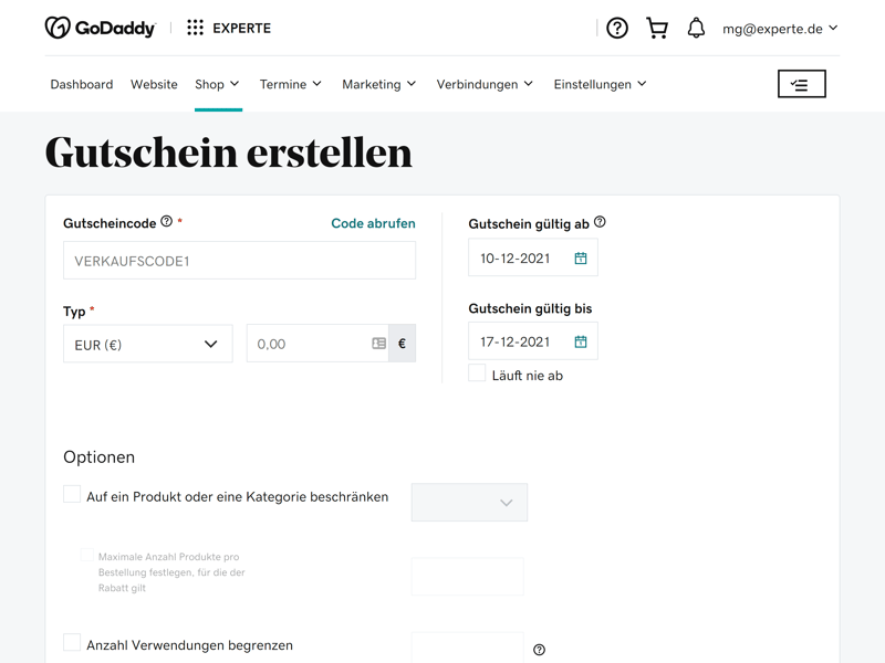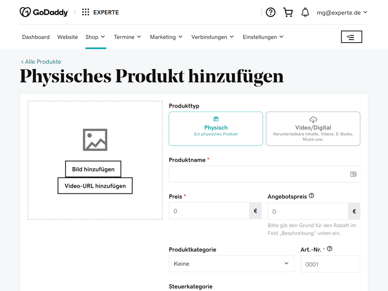 GoDaddy ermöglicht den Verkauf physischer und digitaler Produkte mit unterschiedlichen Produktvarianten und Rabatten. Die Produktverwaltung ist intuitiv.