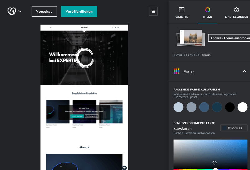 Farben: In diesem Menü legen Sie ein Farbschema für Ihre Website fest. Die Möglichkeiten sind eingeschränkt: Sie können nur eine Grundfarbe auswählen und mit einem Schieberegler die Helligkeit einstellen. Die Farben individueller Bereiche lassen sich später noch (minimal) anpassen, doch eine detaillierte Konfigurierung der seitenweit verwendeten Farben ist nicht möglich.