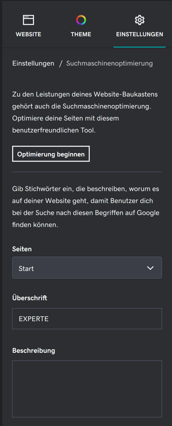 Navigationsmenü: In diesem Menü wechseln Sie zwischen den drei wichtigsten Bereichen des Editors. Im Tab „Website“ verwalten Sie die Seiten Ihrer Website, im Tab „Theme“ das Design. In den „Einstellungen“ können Sie grundlegende Angaben zur Website machen, SEO-Optionen anpassen, Social Media-Links einfügen und Analytics-Tracker einbauen.