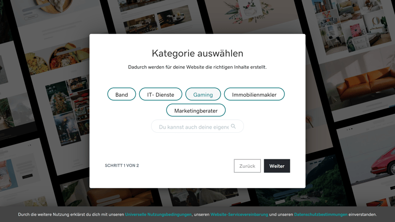 Nach der Registrierung landen Sie im GoDaddy-Dashboard, wo Sie direkt mit der Erstellung Ihrer ersten Website beginnen können. Dafür wählen Sie zunächst eine Kategorie aus, die Ihre Website oder Ihr Unternehmen am genauesten beschreibt. GoDaddy stellt Ihnen einige Kategorien zur Auswahl, doch Sie können per Suchfunktion auch selbst passende Stichworte eingeben.