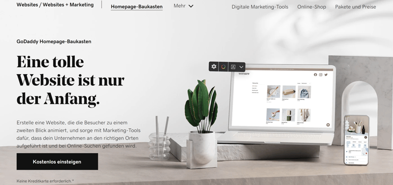 Navigieren Sie auf der GoDaddy-Website einfach zum Homepage-Baukasten und klicken Sie auf „Kostenlos einsteigen“, um die Registrierung zu starten.