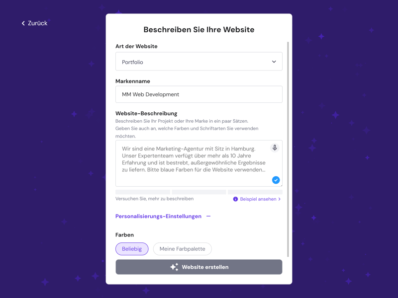 Die Einrichtung ist simpel: Sie müssen nur die Art Ihrer Website angeben und eine Beschreibung hinzufügen, die als KI-Prompt dient. Optional können Sie auch eine Farbpalette definieren. Dann macht sich die KI ans Werk und erstellt eine Erstfassung Ihrer Website.
