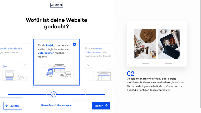 Wenn Sie bereits einen Jimdo-Account angelegt und eine Website mit dem einfachen Editor erstellt haben, erreichen Sie dieses Auswahlmenü, indem Sie eine neue Website im Projekte-Bereich starten.
