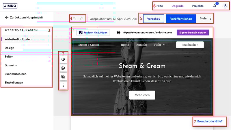 Navigationsmenü: In der Menüleiste navigieren Sie zu den unterschiedlichen Funktionen des Editors. Hier wechseln Sie beispielsweise zu den Design-, Seiten-, SEO- und anderen Einstellungen.