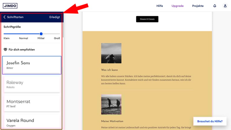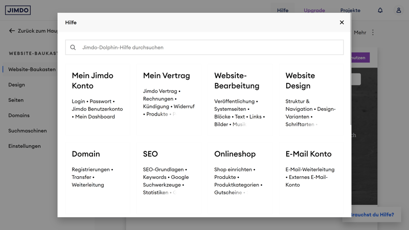 Obere Menüleiste: Die obere Menüleiste führt Sie unter anderem zu Ihrem „Projekte“-Bereich, wo Sie alle Ihre Jimdo-Websites verwalten, und zu Ihrem Profil mit Kontoeinstellungen. Den Hilfebereich und die Möglichkeit, Ihr Paket upzugraden, finden Sie hier auch.