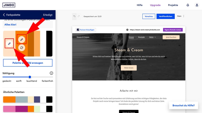 Farbpalette: Jimdo sorgt automatisch dafür, dass die Farbpalette Ihrer Website stimmig ist. Sie müssen nur zwei Farben auswählen, die Ihnen gefallen, und der Baukasten generiert weitere Farben für eine insgesamt harmonische Farbgestaltung. Zudem können Sie eine Palette aus einem Bild generieren, die Sättigung mit einem Schieberegler bearbeiten und ähnliche Paletten zur aktuellen auswählen.