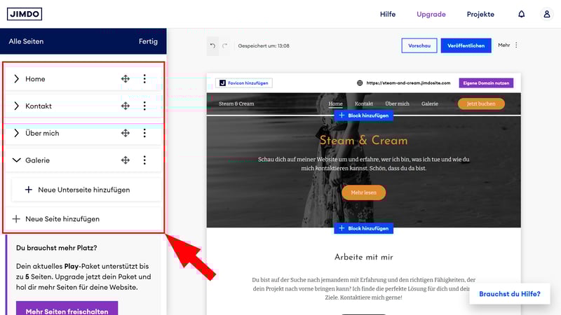 Im Menü links sehen Sie alle aktuell vorhandenen Seiten aufgelistet. Sie können sie per Drag-and-drop verschieben, um ihre Position im Menü anzupassen. Natürlich können Sie auch mit wenigen Klicks neue Seiten oder Unterseiten anlegen.