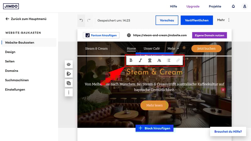 Die Inhalte Ihres Blocks bearbeiten Sie nun direkt in der Website-Vorschau. Die verfügbaren Werkzeuge sind je nach Inhaltstyp unterschiedlich.