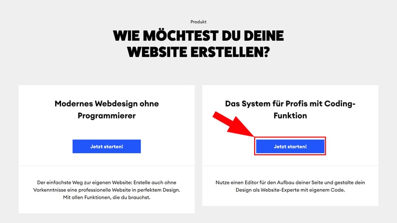 Wählen Sie im anfänglichen Auswahlmenü das „System für Profis mit Coding-Funktion“ auf der rechten Seite, um Ihre Website mit dem erweiterten Editor zu gestalten.