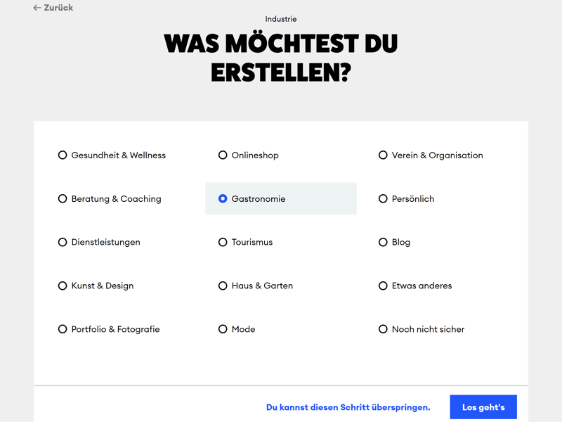 Zunächst müssen Sie wieder ein paar Angaben zu Ihrem Projekt machen. Geben Sie Ihre Industrie an und entscheiden Sie sich für eines der Design-Templates; im Anschluss können Sie auch gleich einen Tarif auswählen und eine Domain verbinden.
