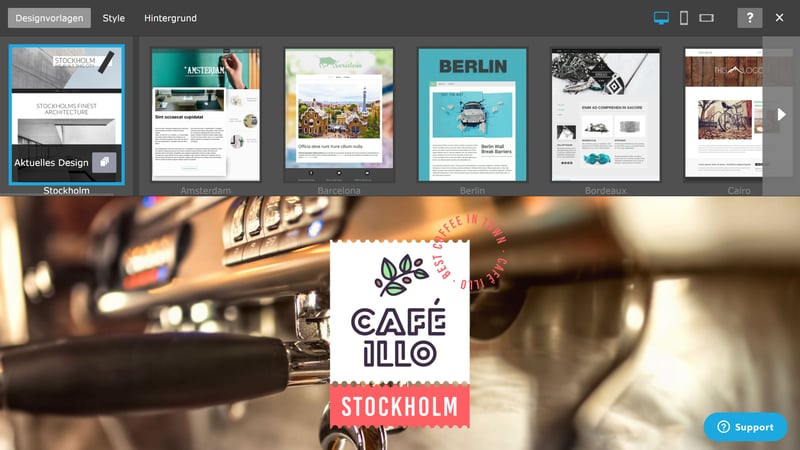 Hier finden Sie drei Optionen: „Designvorlagen“, „Style“ und „Hintergrund“.