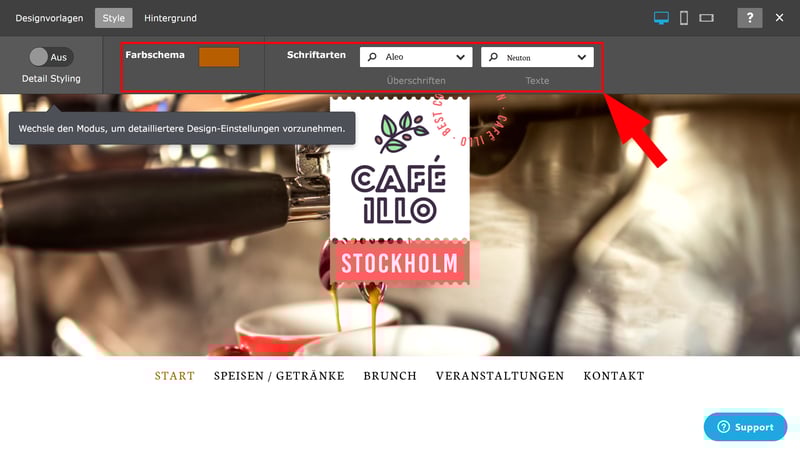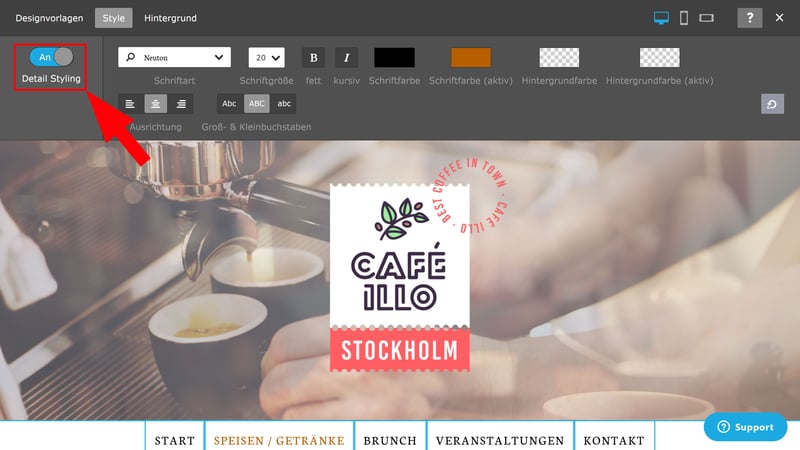 Wenn Ihnen die globalen Einstellungen nicht ausreichen und Sie die Farben und Schriftarten im Detail anpassen möchten, müssen Sie in den „Detail Styling“-Modus wechseln.
