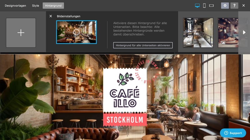Dann haben Sie natürlich noch die Möglichkeit, den Hintergrund Ihrer Seiten bzw. der gesamten Website festzulegen. Dafür können Sie Bilder, Videos oder Farben verwenden. Die Größe und Platzierung des Hintergrunds wird vom Template vorgegeben.