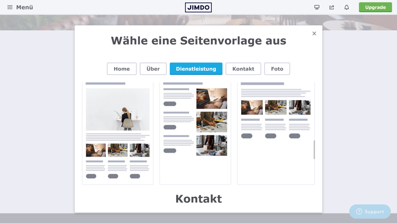 Die Template-Auswahl ist jedoch eingeschränkt: Jimdo bietet Vorlagen für Home-, Über uns-, Dienstleistungen-, Kontakt- und Foto-Seiten, aber keine spezialisierteren Seitentypen.
