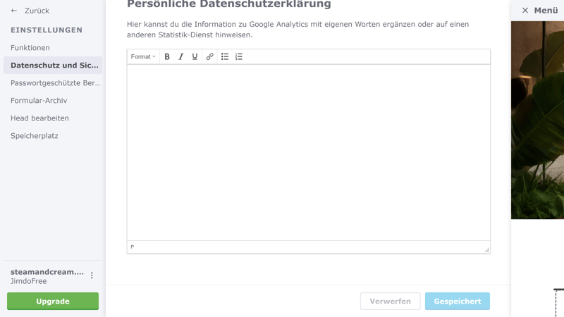 Ihr Impressum können Sie direkt im Editor bearbeiten (wie Sie Inhalte auf Seitenebene editieren, verraten wir gleich). Ihre Datenschutzerklärung und verwandte Aspekte (z. B. den Cookie-Hinweistext und den Datenschutzhinweis für Formulare) passen Sie hingegen in den Einstellungen unter „Datenschutz und Sicherheit“ an.