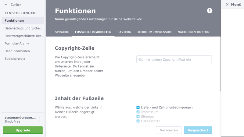 Hier können Sie einen Copyright-Text einfügen, der dann auf allen Seiten im Footer angezeigt wird, und angeben, welche Inhalte in der Fußzeile verlinkt werden sollen.