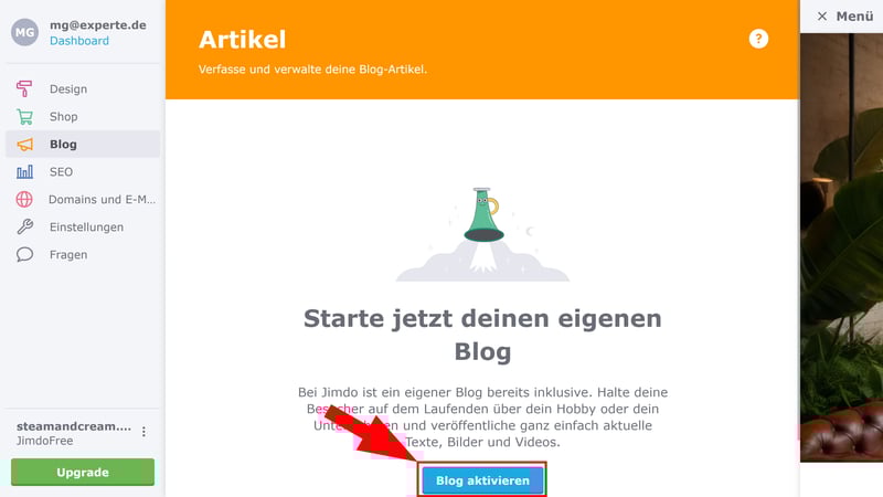 Im Gegensatz zum einfachen Editor unterstützt Jimdos Profi-Editor auch Blogs. Den können Sie Ihrer Seite im gleichnamigen Menüpunkt hinzufügen, indem Sie auf „Blog aktivieren“ klicken. Dann wird automatisch eine Blogseite angelegt und im Navigationsmenü Ihrer Seite hinzugefügt.