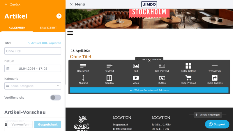Um einen neuen Blogbeitrag hinzuzufügen, klicken Sie im Blog-Bereich auf „Neuer Artikel“. Den Artikel selbst können Sie dann in der Live-Vorschau mit allen klassischen Editor-Werkzeugen anlegen, während Sie auf der linken Seite einige Einstellungen – beispielsweise zur Kategorie und dem Veröffentlichungsdatum – vornehmen können.